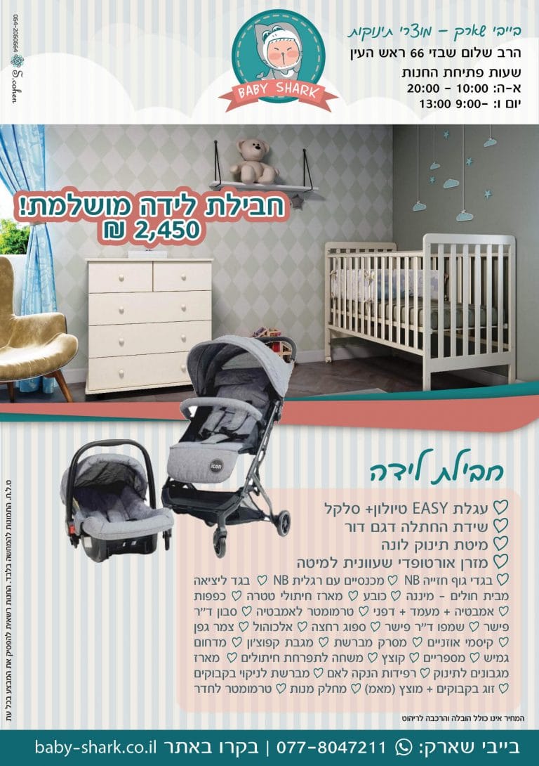 מחפשים חבילות לידה? מחפשים מתנות ליולדת ולתינוק? מחפשת מוצרים לתינוקות וריהוט לחדר תינוקות? אצלנו באתר בייבי שארק תמצאו חבילת לידה אטרקטיבית עם ציוד לתינוקות שכוללת מגוון מוצרים ענק לתינוק – כמו עגלה לתינוק, שידת החתלה, מיטת תינוק עם מזרן אורתופדי אמבטיה לתינוק עם מעמד ודפני ועוד מגוון פריטים חיוניים כחלק מחבילת הלידה שתוכלי למצוא אצלנו.