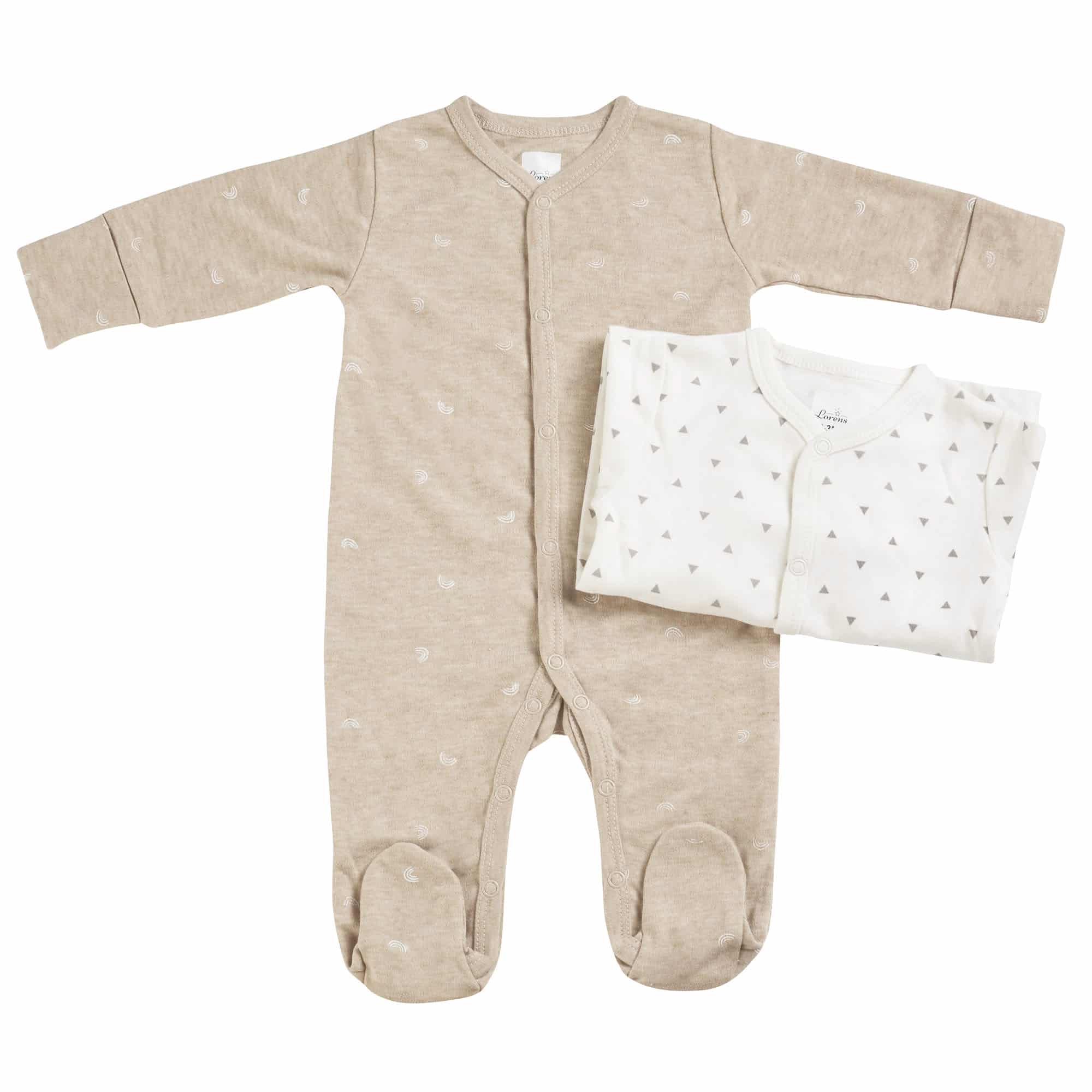 מארז זוג אוברולים מבד טריקו עם הדפס קשת בענן ומשולשים הכי מתוק, רך ומכרבל שיש!