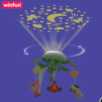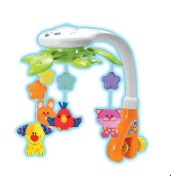 מובייל מנגן עם דמויות חביבות של בעלי חיים ואפשרות להקרנת מופע מואר של גרמי שמים על תקרת החדר.