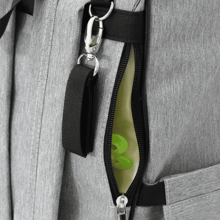 • בגב התיק ישנו תא לאחסון פריטים קטנים כגון מוצץ, מפתחות וכו’ ושני מתלים מיוחדים לתלית התיק על העגלה