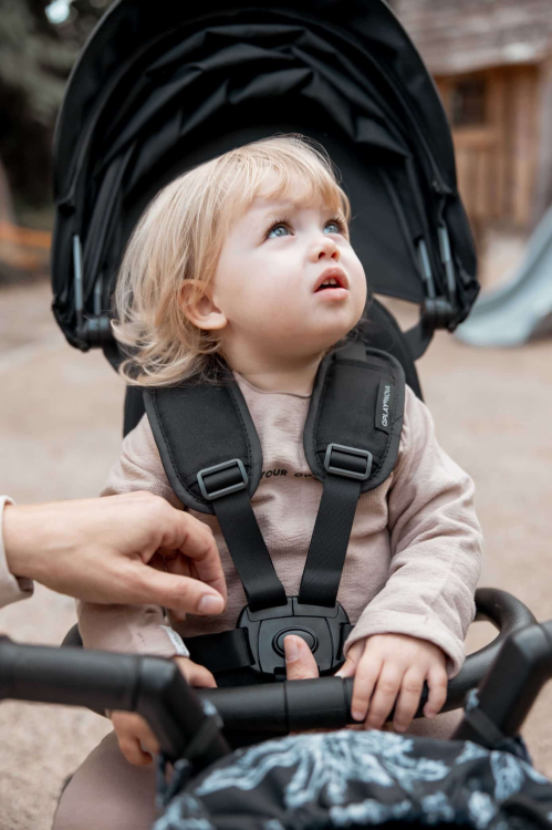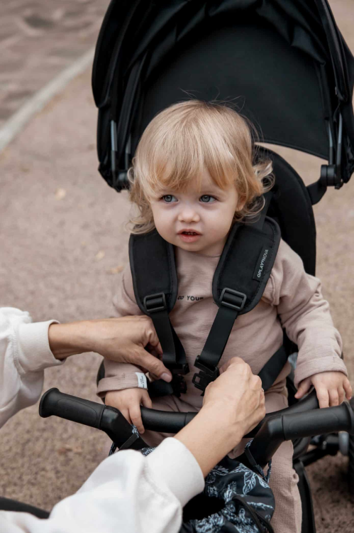 מגיע עם ידית דחיפה טלסקופית מתקפלת, גגון מעוצב, להגנה מקרינת UV, דוושות מונעות החלקה.